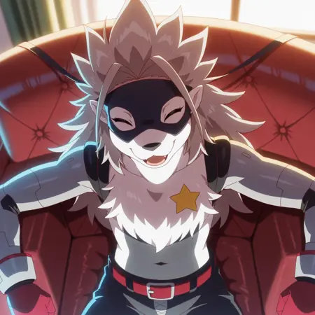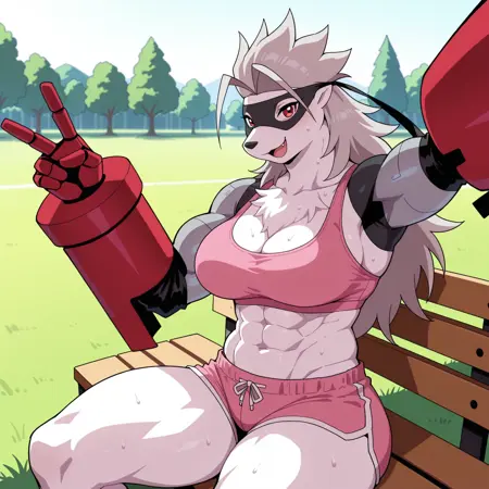 正向提示:WolvermonBB,毛茸茸的女性,拟人化,鼬科动物,灰发,长发,尖刺发型,红眼,黑瞳,黑鼻子,黑色眼罩,白色身体,白毛,灰色身体,双色身体,胸前黄色星星,红色机械臂,粗壮手臂,机械改造