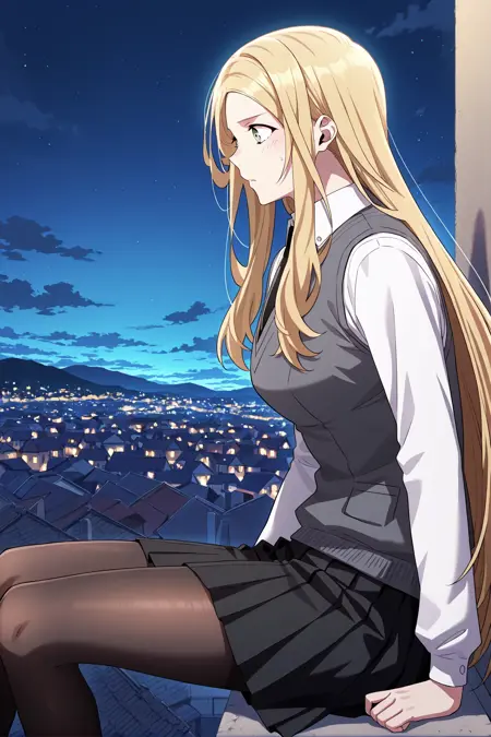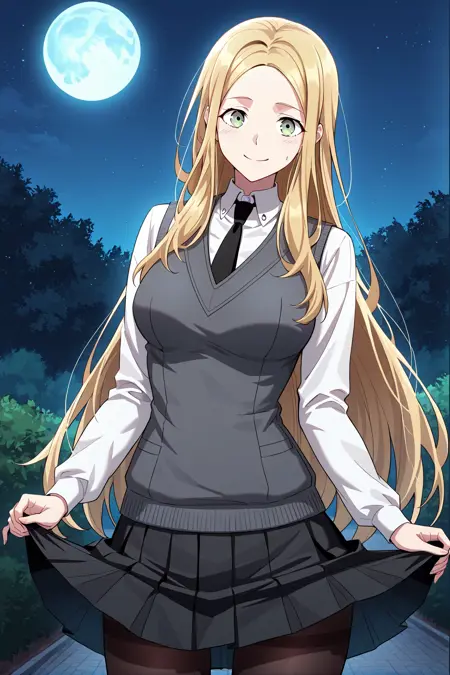 韩吉_服装3,灰色背心,白色衬衫,衬衫领,黑色领带,黑色百褶裙,透明丝袜,