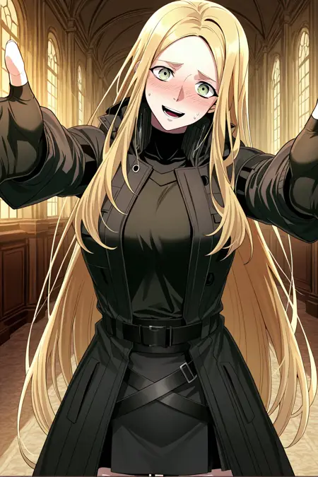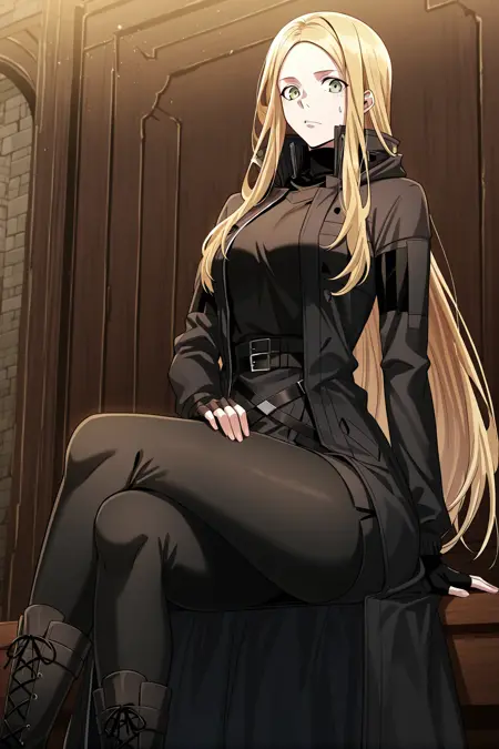韩吉_服装1,黑色外套,长外套,长袖,高领外套,敞开式外套,黑色衬衫,高领衬衫,黑色手套,露指手套,黑色交叉腰带,黑色裙子,短裙,黑色裤子,黑色靴子,