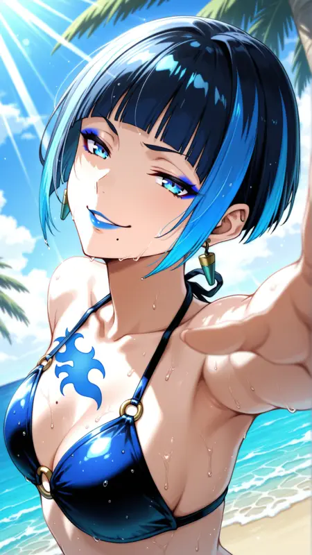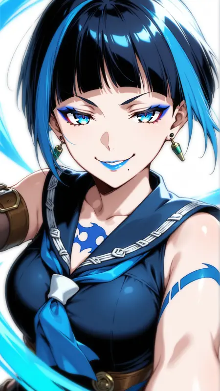 Appearance:short hair, blue hair, makeup, blue eyes, multicolored hair, black hair, two-tone hair, blue lips, bob cut, eyeshadow, mole under mouth, streaked hair,chest tattoo, tattoo,