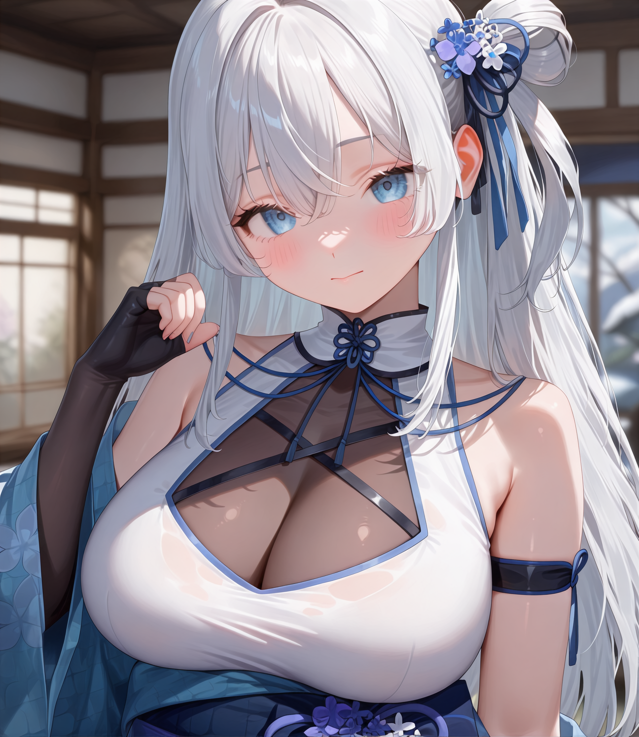 1girl, white hair,blue eyes, hair ornament,
