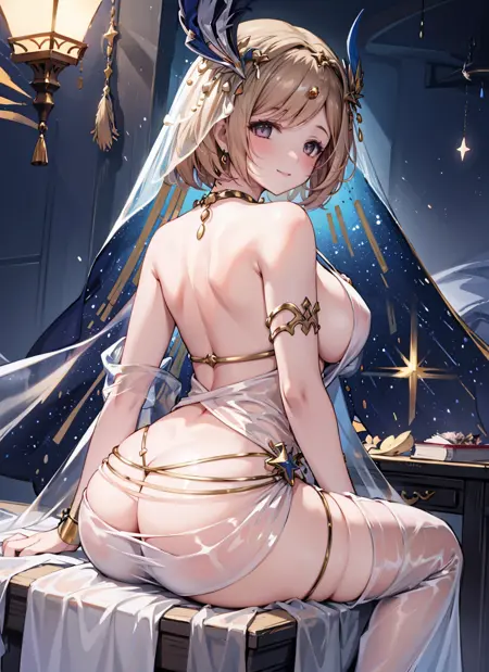트리거 단어: 민소매 드레스, 투명, 스카프, 팔찌, 보석, 원형 머리장식, 베일