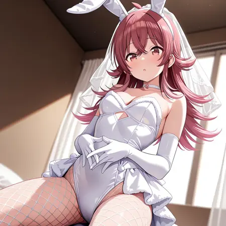 red hair, long hair, red eyes,medium breasts,hair between eyes,ahoge,crossed bangs,