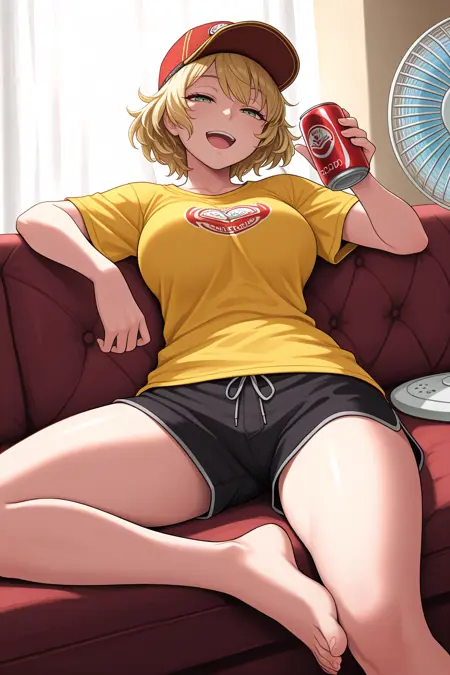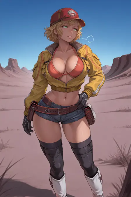 그녀의 전형적인 외모를 표현하려면 "빨간 야구 모자, 목에 안경 매달기, 노란 재킷, 단정한 재킷, 지퍼 풀린 상태, 주황색 비키니, 비키니 상의만, 옷 안에 비키니, 검은 장갑, 갈색 벨트, 벨트 주머니, 청바지 반바지, 짧은 반바지, 검은 허벅지 긴 양말, 흰색 부츠, 무릎 부츠"를 추가하세요.