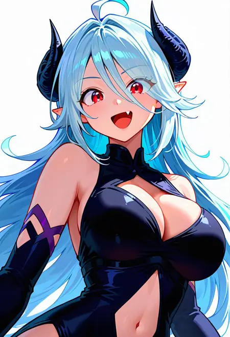 외모: 만화, 컬러풀, 1소녀, 혼자, 악마 소녀, 뿔, 날카로운 귀, 붉은 눈, 흰 머리, 긴 머리, 앞머리, 머리카락 사이로 보이는 눈, 눈 사이의 머리카락, 아호게, 문신, 큰 가슴, 가슴 사이,