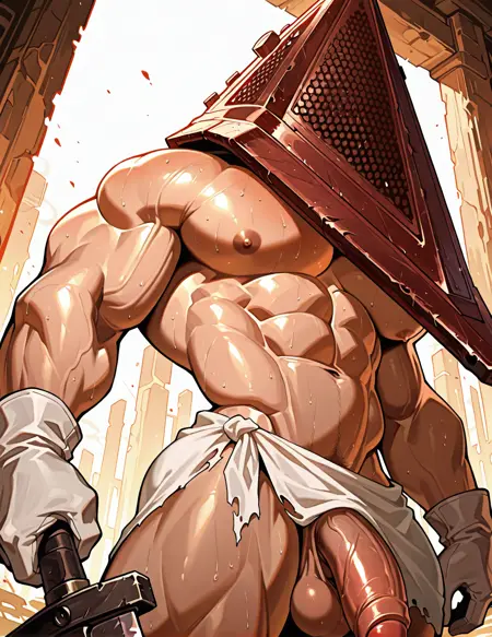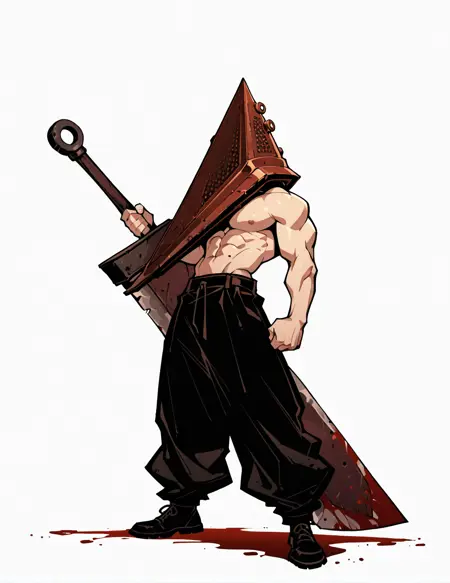 pyramid_head, solo, 1boy, navel, nipples, monochrome, male focus, weapon, cowboy shot, pants, belt, sword, stomach, feet out of frame, muscular, blood, colored skin, abs, muscular male, pectorals, bara, knife, large pectorals, topless male, spot color, bare pectorals, grey skin, planted, monster boy, black skin, blood on weapon, no nipples, object head, black pants
