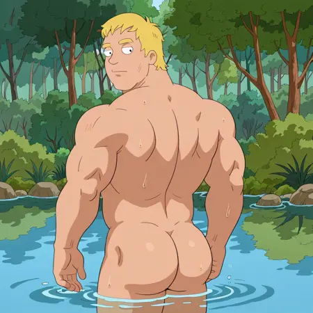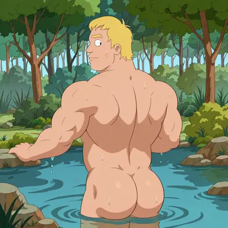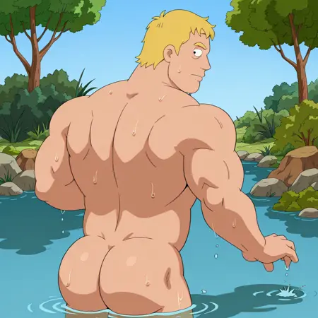 Dan, 1man, male, mature male, blonde hair, round ears, black eyes, buff, muscular, shirtless, blue overalls, black shoes,