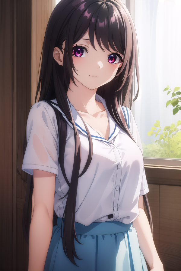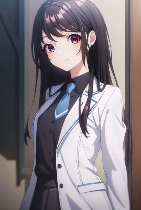 kaori houjou, long hair, bangs, (black hair:1.5), (red eyes:1.3), sidelocks, smile,