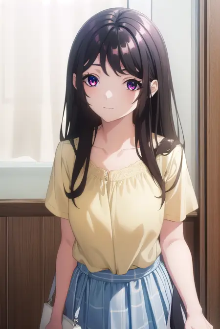 skirt, shirt, collarbone, short sleeves, bag, blue skirt, yellow shirt, handbag,