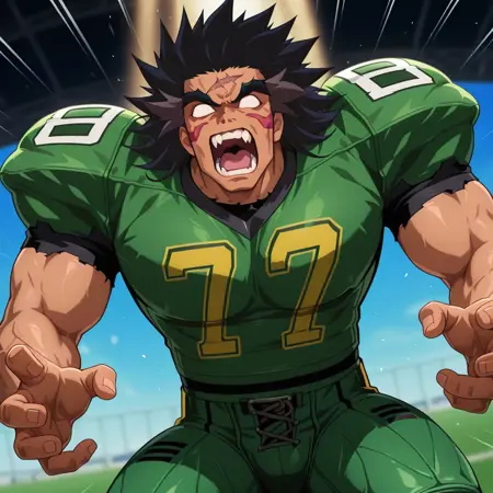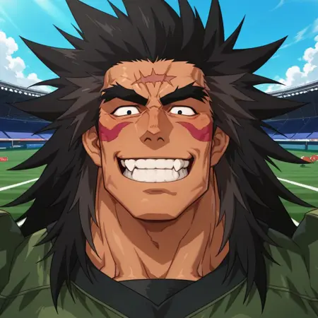 gao, Black hair,red facial tattoo, long hair,fluffy hair, spiked hair,black eyes, no beard,muscular male, thick eyebrows, forehead scar,