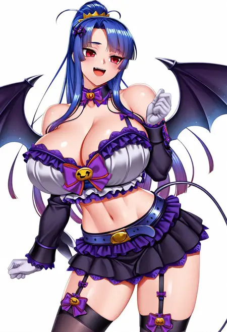 **태그: PD Murasaki, **PD Murasaki, 활, 어깨 노출, 가슴 노출, 분리된 소매, 허리, 흰 벨트, 흰 장갑, 검은 스커트, 가터 스트랩, 검은 허벅지 양말, 꼬리, 머리 장식, 프릴, 미니 스커트, 흰 브라 탑, 박쥐 날개, 분리된 칼라,