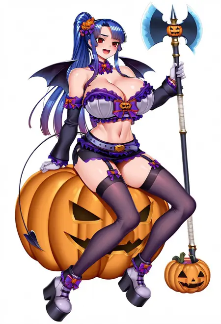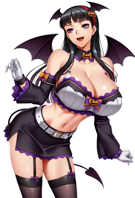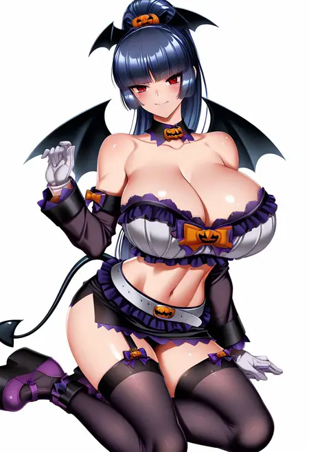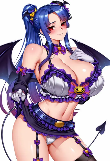 タグ:PD Murasaki、PD Murasaki、 bow、裸肩、胸元、取り外し可能な袖、腹部、白いベルト、白い手袋、黒いスカート、ガーター straps、黒い太ももハイ、尾、髪飾り、フリル、ミニスカート、白いブラトップ、蝙蝠の翼、取り外し可能なカラー、