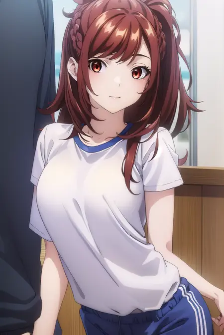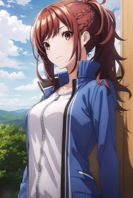 kaede kazama, long hair, bangs, (red eyes:1.3), ponytail, braid, sidelocks, red hair,