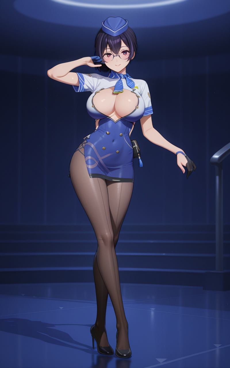 여객기 승무원 유니폼, 하이힐, 파란색 모자, 부분적으로 손가락이 드러난 장갑, 안경, 이음새 있는 팬티스타킹, 검은 팬티스타킹, 팬티스타킹,