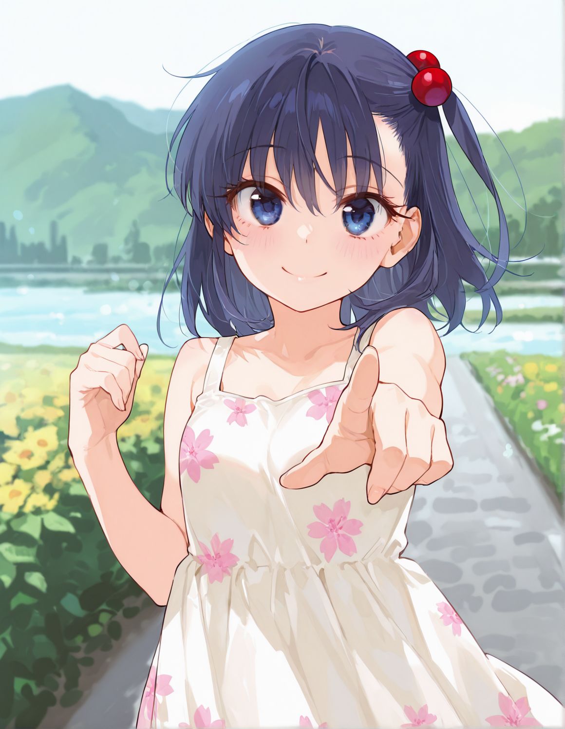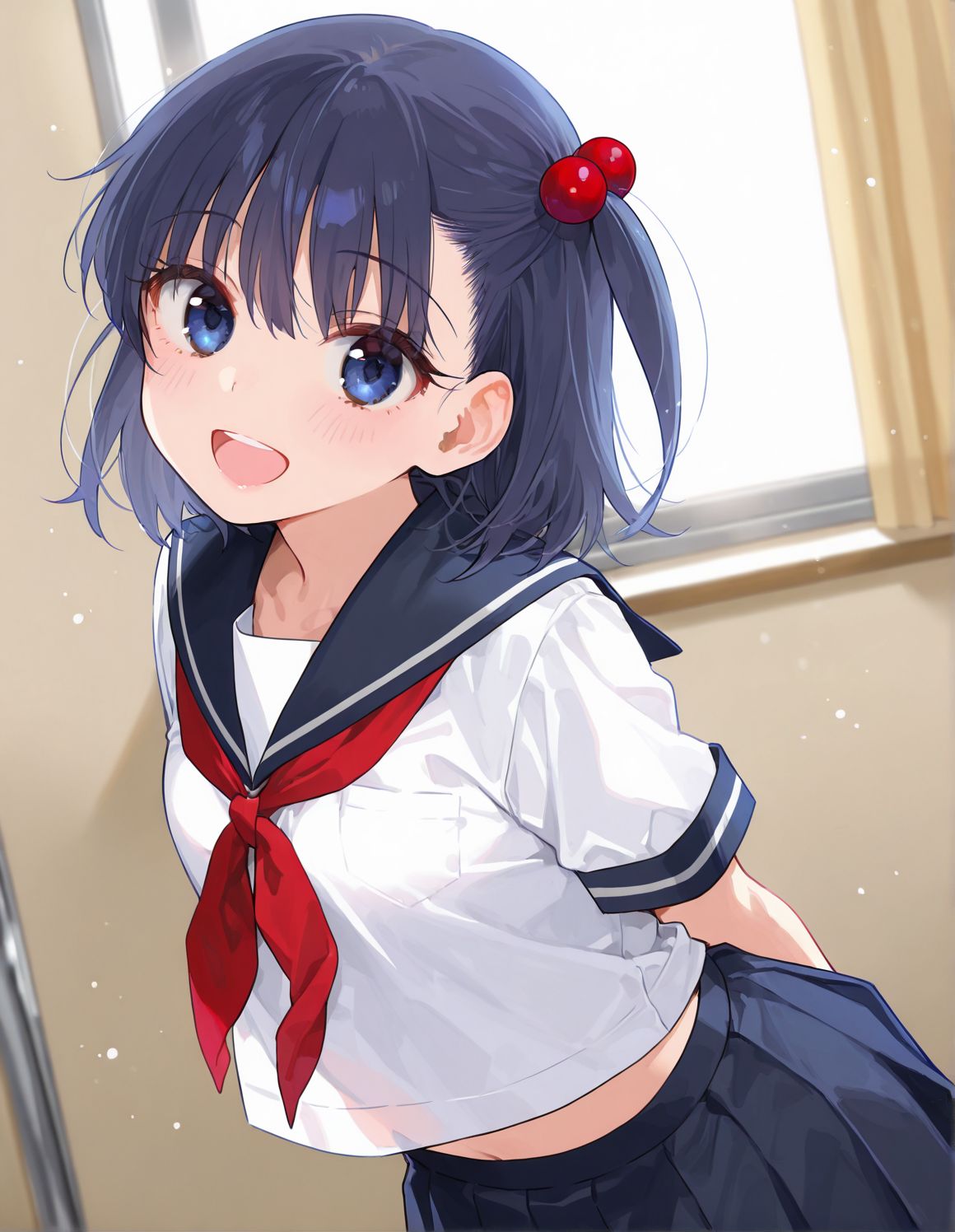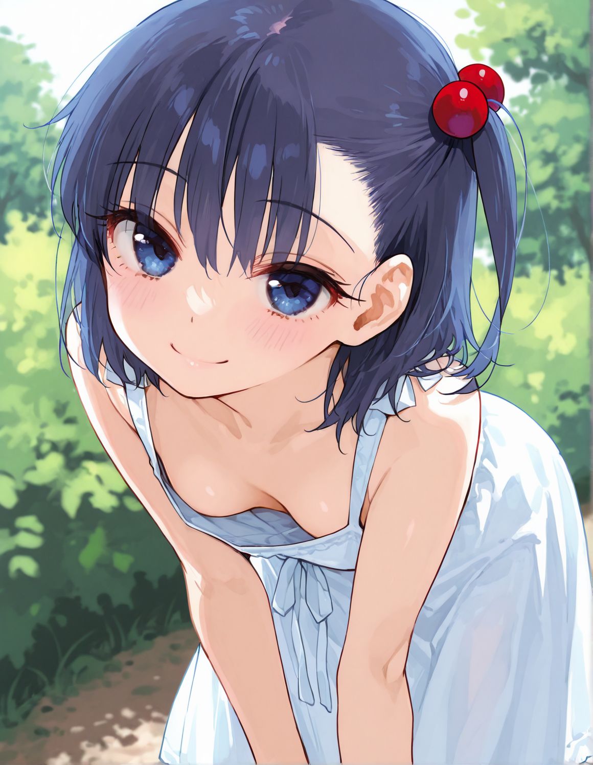 satonaka chie \(ooya-san wa shishunki\), blue eyes, hair ornament, hair bobbles, blue hair, one side up, short hair, side ponytail,