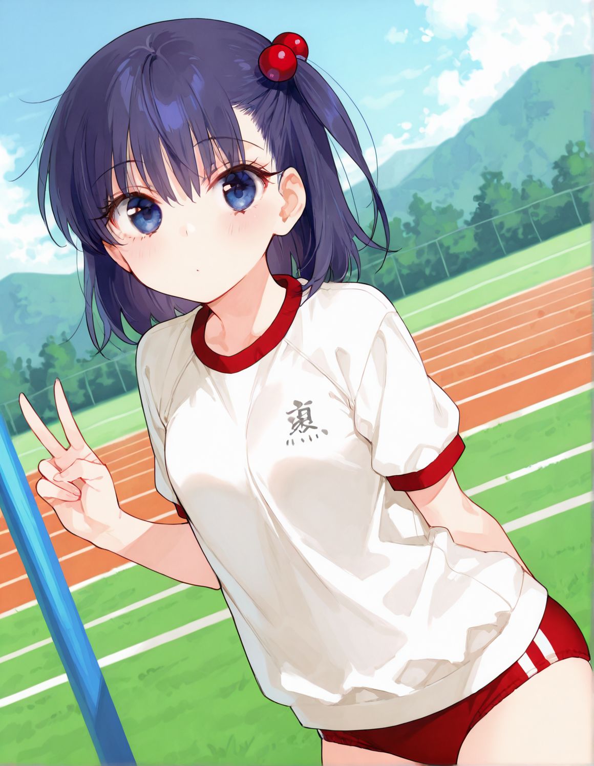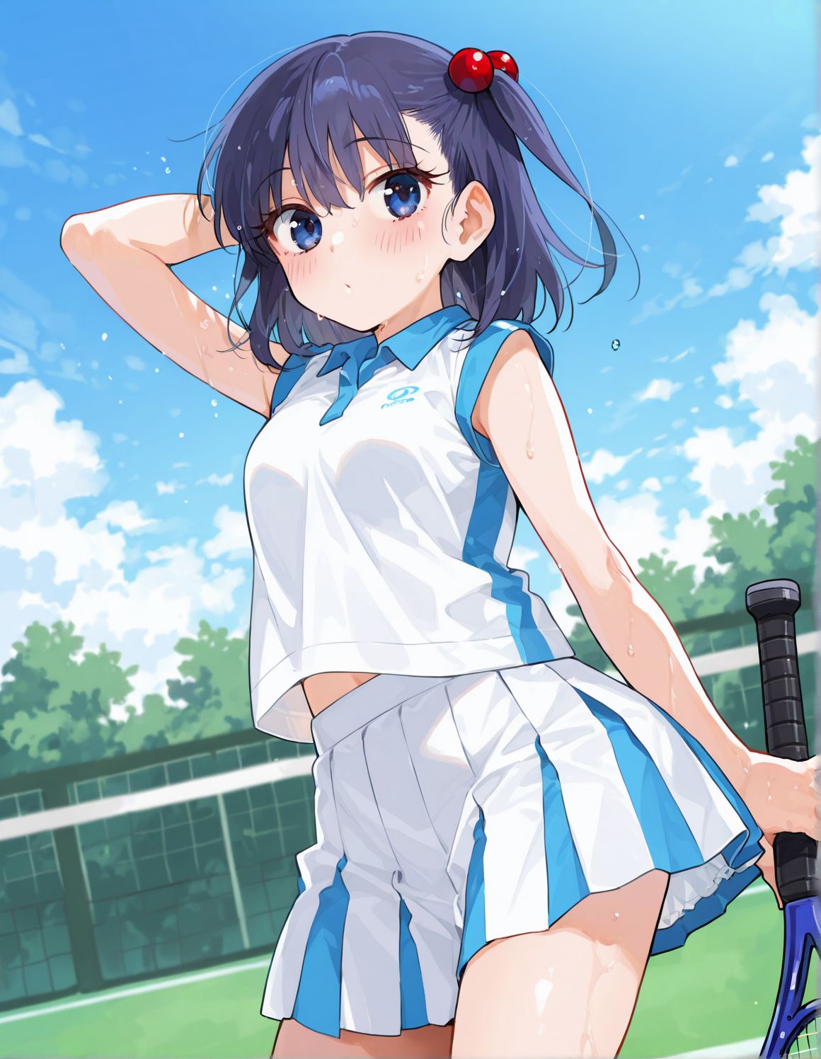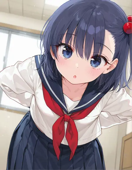 satonaka chie \(ooya-san wa shishunki\), blue eyes, hair ornament, hair bobbles, blue hair, one side up, short hair, side ponytail,