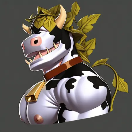 Cowplant, leafs, horns, nostrils, udder, cowbell, cow print, animal print, tusks, 1boy, solo, bara, male Focus, furry, muscular, pectorals, cow boy,