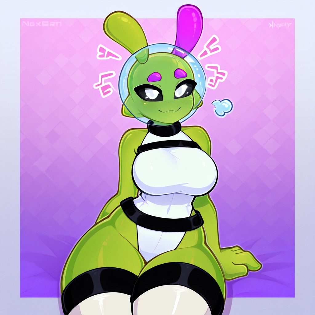 alien girl, green skin, white eyes, black sclera, bald, pink eyebrows, (antennas, asymmetrical antennas, green antenna, pink antenna)