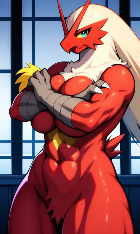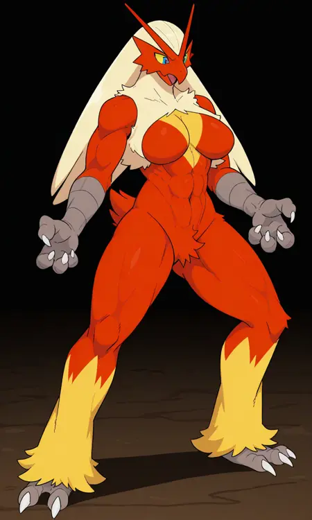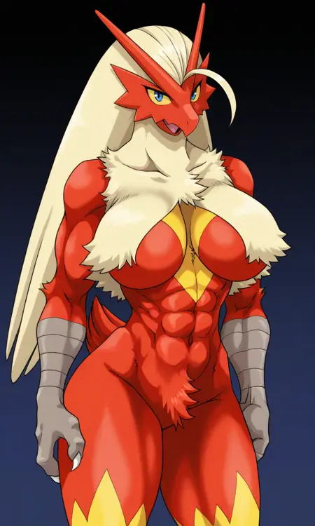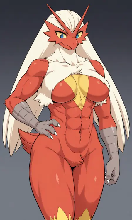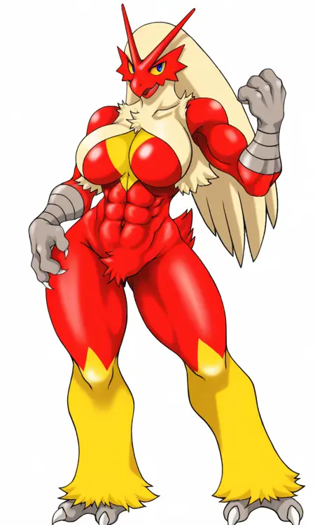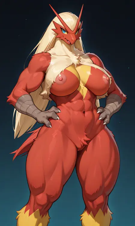 | 训练词汇 | blaziken, 1girl, abs, beak, bird girl, bird tail, blonde hair, blue eyes, body fur, breasts, claws, furry female, long hair, navel, neck fur, no pussy, nude, red fur, scuted arms, thick thighs, toned female, two-tone fur, yellow fur, yellow sclera, muscular female已复制! |