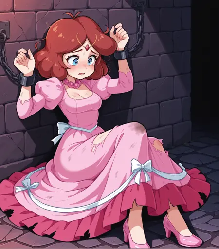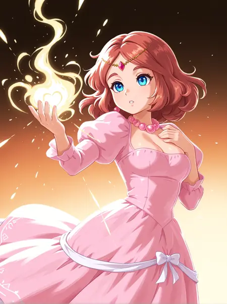 茶色の髪、ふわふわした髪、滑らかな髪、青い目、胸元、髪飾り、頭飾り、頭部チェーン、ゴールドの髪チェーン、赤い宝石、赤い額の宝石、ピンクの真珠のネックレス、ドレス、ロングドレス、ドレスリボン、白いリボン、ジュリエットスリーブ、