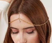 棕色头发,蓬松头发,顺滑头发,蓝色眼睛,胸部曲线,发饰,头饰,头链,金色发链,红色宝石,红色额饰,粉珍珠项链,连衣裙,长裙,裙带,白色丝带,朱丽叶袖,