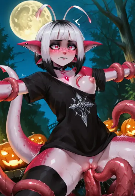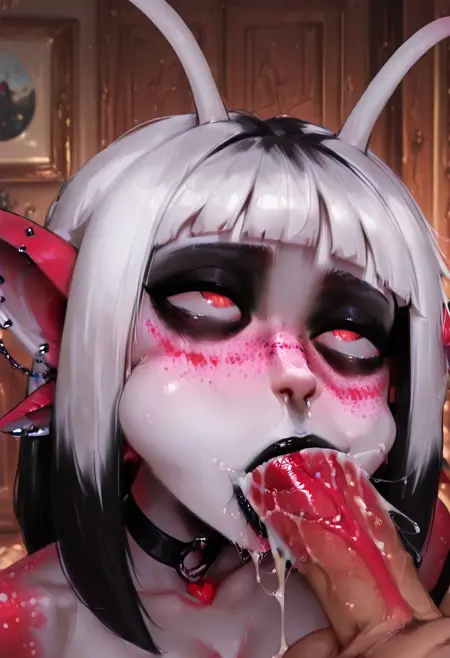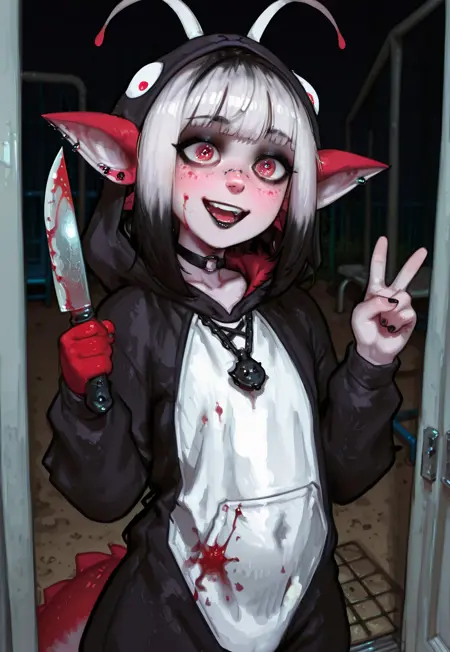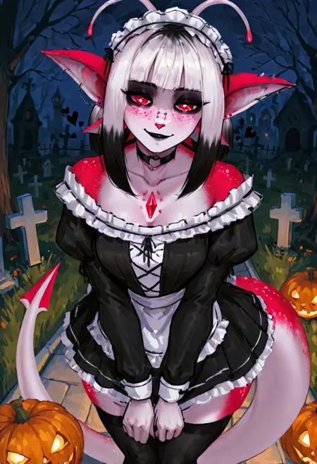 Junjira, anthro female, antenna, two-tone skin, red eyes, black eyeshadow, black lipstick, two-tone hair, white hair, black hair, bangs, pointy ears, bridge piercings, jewelry, freckles, choker, tail,
