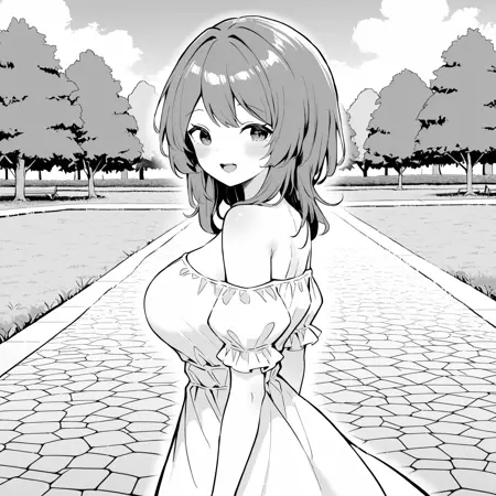 3. yuzumng, 1girl, medium hair, breasts, yuzucas, dress, bare shoulders, off shoulders, short sleeves