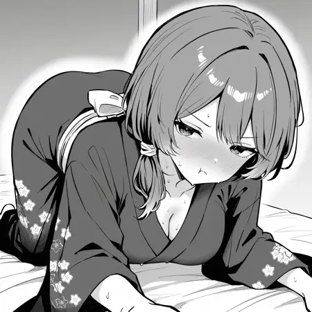 6. yuzumng, 1girl, medium hair, breasts, yuzukim, japanese clothes, obi, wide sleeves, kimono, sash, low ponytail, print kimono