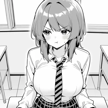 2. yuzumng, 1girl, medium hair, breasts, yuzusch, collared shirt, plaid skirt, skirt, shirt, school uniform, necktie, diagonal striped necktie, long sleeves