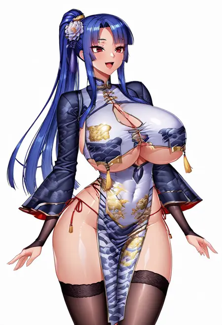 タグ: PB ムラサキ、バストライン、白いチャイナドレス、髪飾り、ブラックのタイツ、サイドタイアップパンツ、ブライダルガントレット、骨盤カーテン、髪の花、長袖、ワイドスリーブ、アンダーブラスト