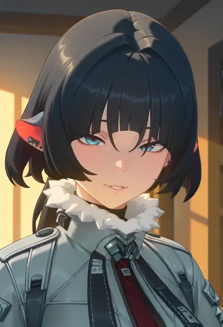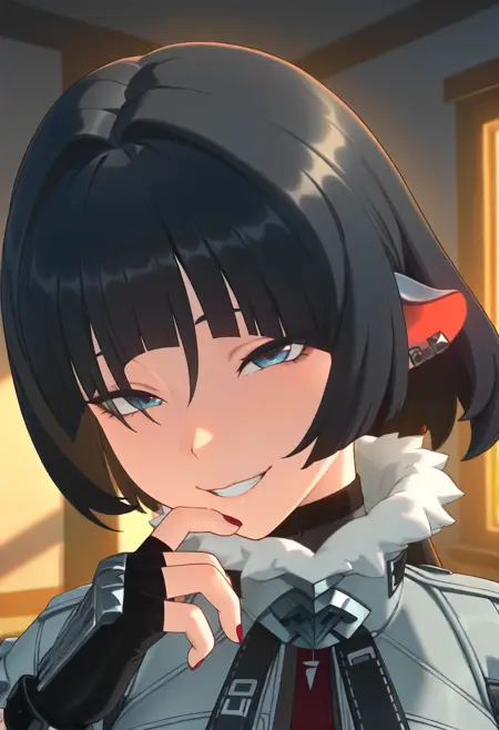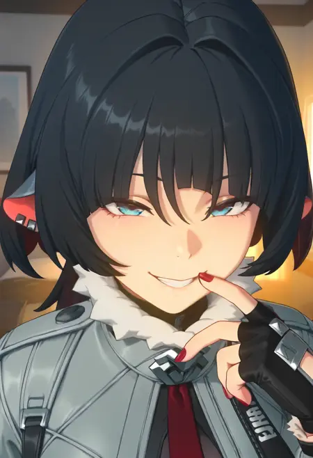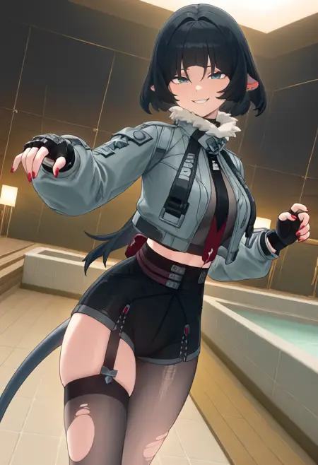 | 학습된 단어 | 1girl, Jane Doe, solo, black hair, bangs, low ponytail, red ponytail hair, blue eyes, rat ears, ear piercings, red nails,복사됨! grey jacket, straps, fingerless gloves, black and red tie, see-through blouse, midriff, black shorts, belts, ripped thigh highs, tail, grey boots, red boot details, asymmetrical legwear, fur trim,복사됨! |