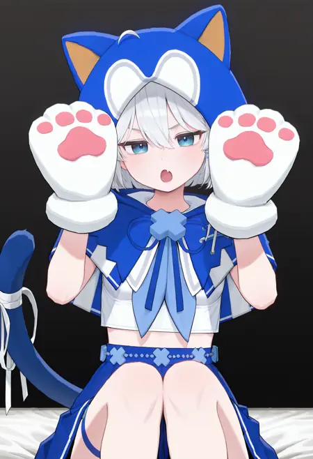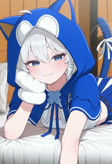 파란 후드, 고양이 후드, 후드 올린, 후드 달린 캐플릿, 아호게, 흰색 머리카락, 눈 사이의 머리카락, 단발, 헤어클립, 파란 눈, 흰색 셔츠, 소매 없는 셔츠, 허리 부분 노출, 파란 리본 넥타이, 파란 목 띠, 흰색 장갑, 발바닥 장갑, 벨트, 파란 치마, 허리 높은 치마, 다색 치마, 허벅지 스트랩, 파란 꼬리, 고양이 꼬리, 꼬리 리본, 흰색 리본,