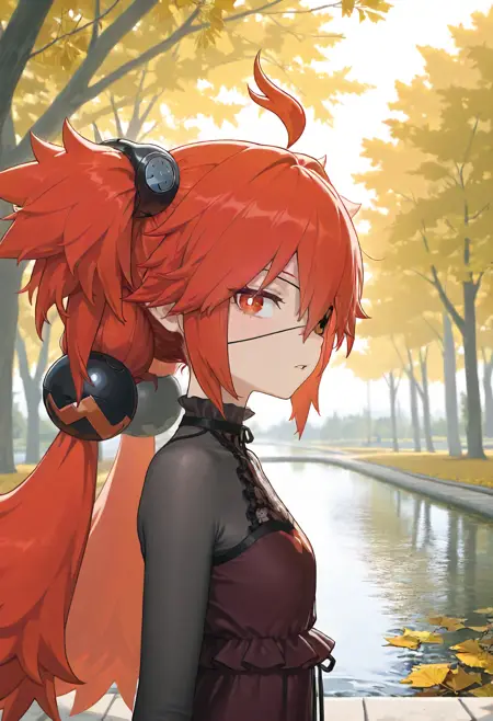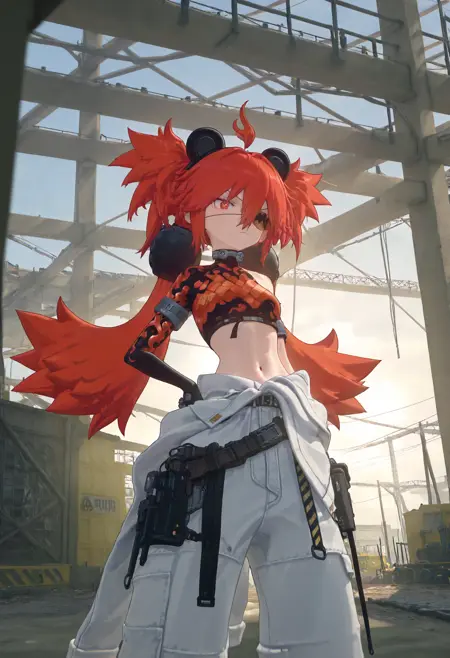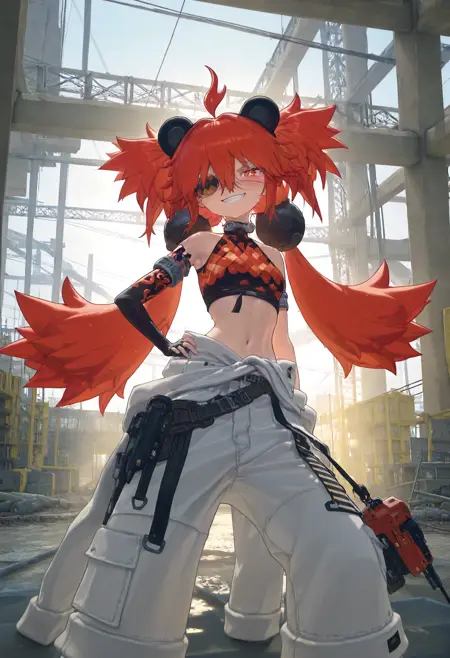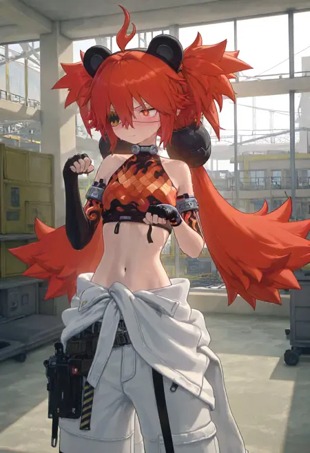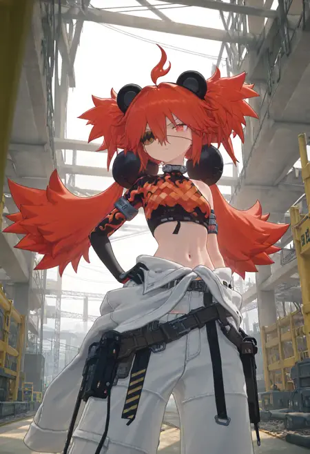 | 训练词汇 | 1girl, Koleda Belobog, solo, red hair, messy hair, red eye, black pupil, twintails, ahoge, fake bear ears, eyepatch, hair ornaments,已复制! collar, crop top, armbands, one sleeve, fingerless gloves, shoulder cut, midriff, navel, jacket tied around waist, construction pants, white pants, red boots,belts, gadgets on hip,已复制! |