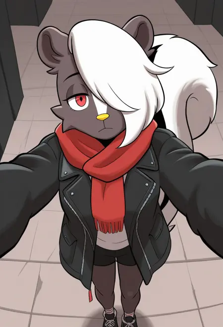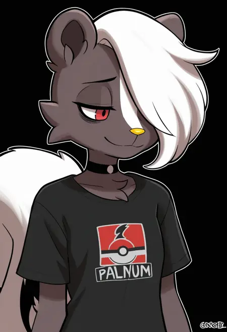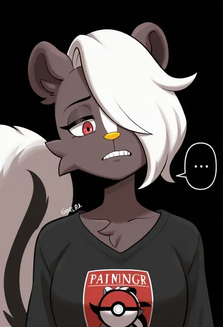 gngr_gb, 1girl, skunk girl,furry, solo, animal nose, animal ears, skunk ears, white hair, red eyes, skunk tail,furry female, tail, hair over one eye, short hair, dark skin,
