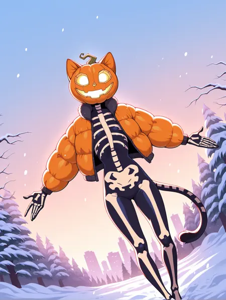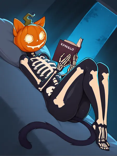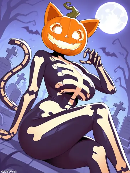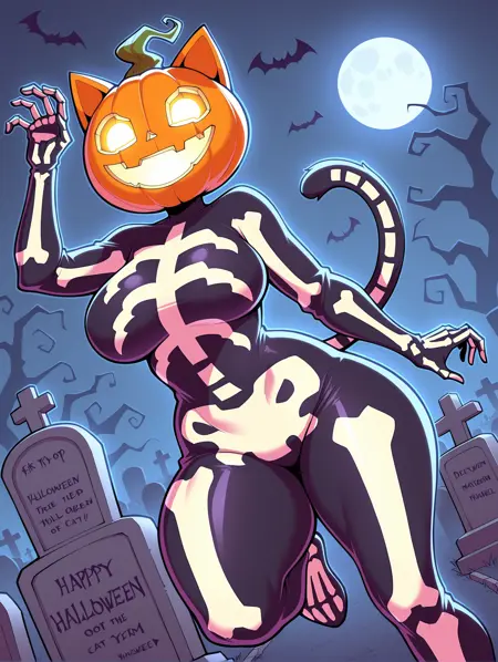 Appearance: sparklelynx, pumpkin mask, skeleton print, cat tail, bodysuit, skin tight, cat ears, glowing eyes