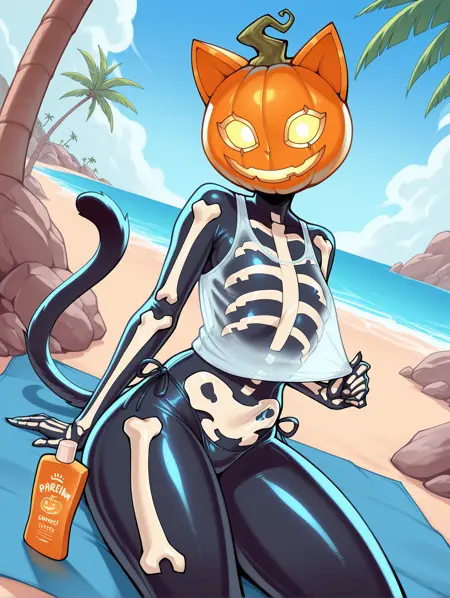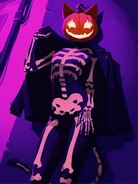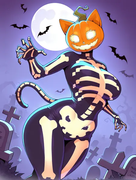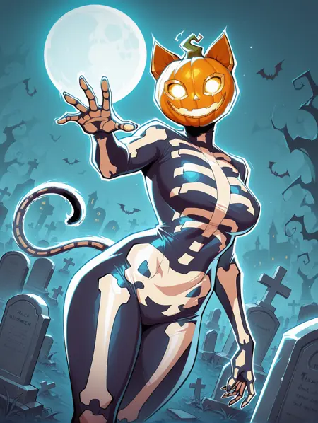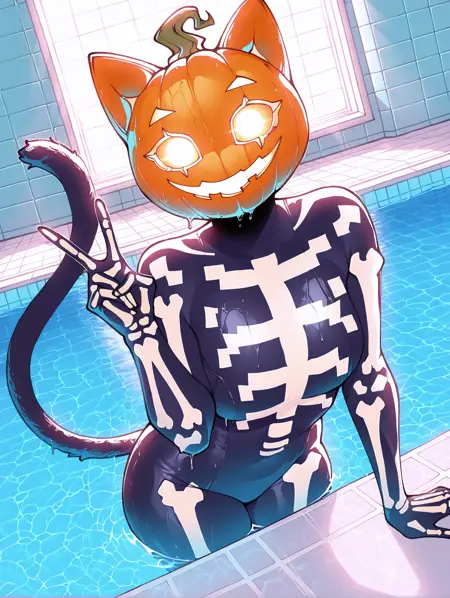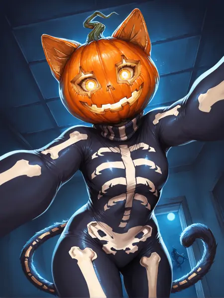在 WAI-NSFW-illustrious-SDXL 上训练外观:sparklelynx,南瓜面具,骷髅图案,猫尾,紧身衣,贴身,猫耳,发光的眼睛