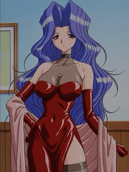 1girl,solo,mm,mature female,long hair,blue hair,purple eyes,mole under eye,large breasts,retro artstyle,1990s (style),anime coloring