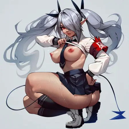 (Blue_Iori, 긴 머리, 회색 머리, 더블테일, 한쪽 눈 위의 머리카락, 붉은 눈, 뾰족한 귀, 꼬리, 셔츠, 넥타이, 팔찌, 치마, 허벅지까지 긴 양말, 신발),