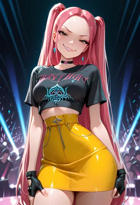 mirakpop, 1girl, solo, 裙子, 手套, 长发, 无指手套, 露脐上衣, 黑色手套, 深棕色眼睛, 项圈, 粉色头发, 珠宝, 耳环, 双马尾, ((黄色裙子)), 胸部, 衬衫, 极长发, 高腰裙