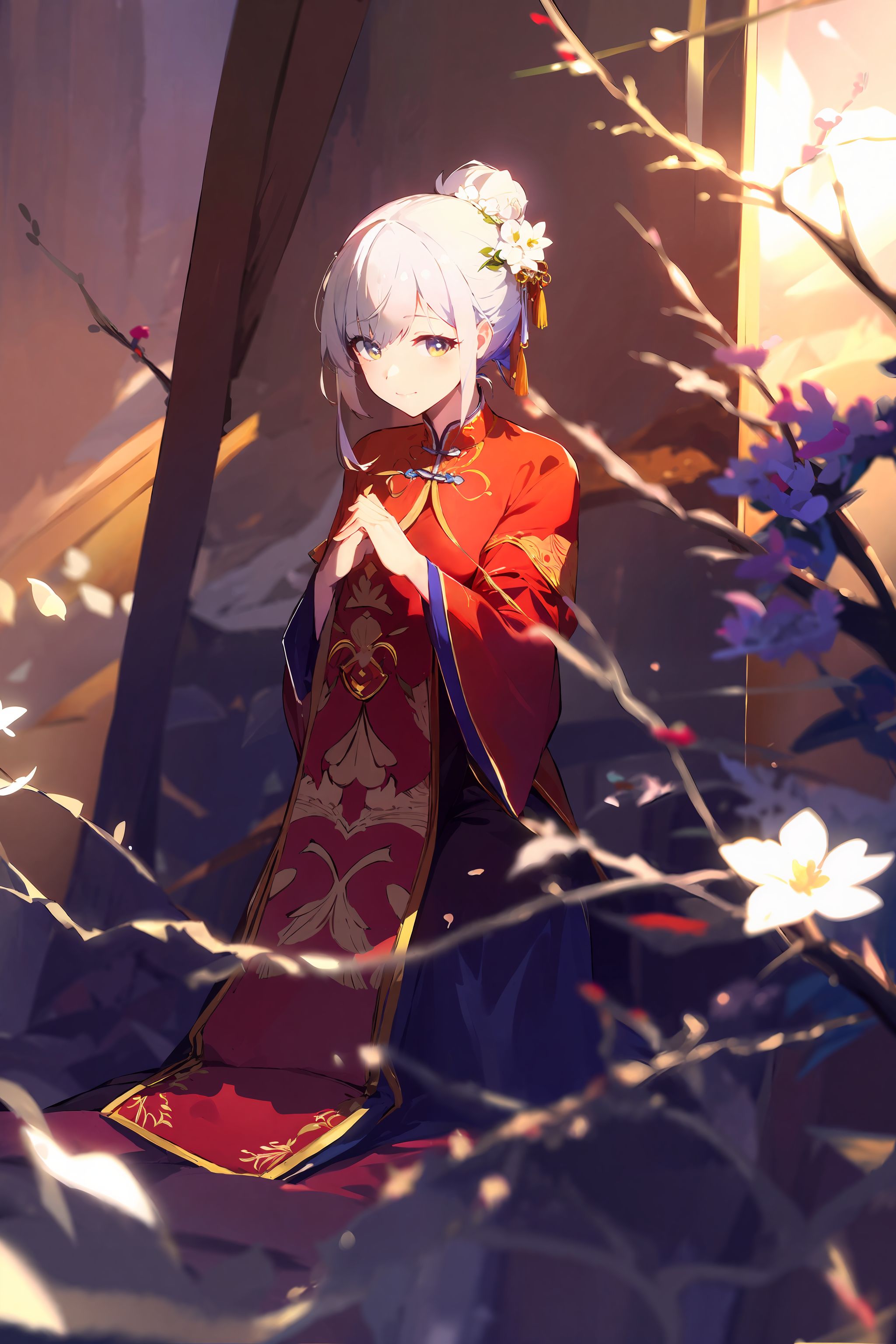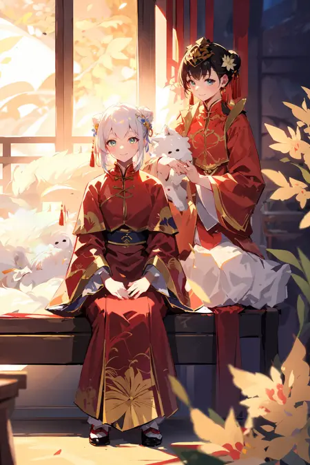 与其说这是一个服装lora,它倒更像是一个画风lora。因为在使用的时候会伴随着那种中式婚礼中喜庆的氛围感,还会增加很多朦胧感。因为训练的图片集很多都来自于b站21年拜年祭短片《不问天》,所以给它取了这个名字。当然也不是只有22和33,还有碧蓝里面的滨江和逸仙的花嫁皮肤,还有一些p站上找来的散图。起因是和朋友聊天说到碧蓝中的中式花嫁皮肤,就只有三款,然后P站上这类的同人图也蛮少的,然而秀禾又是中国人非常喜爱的服饰,所以我训练了这个lora。