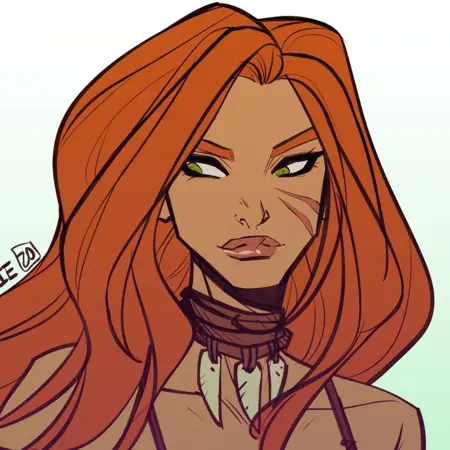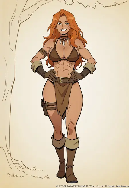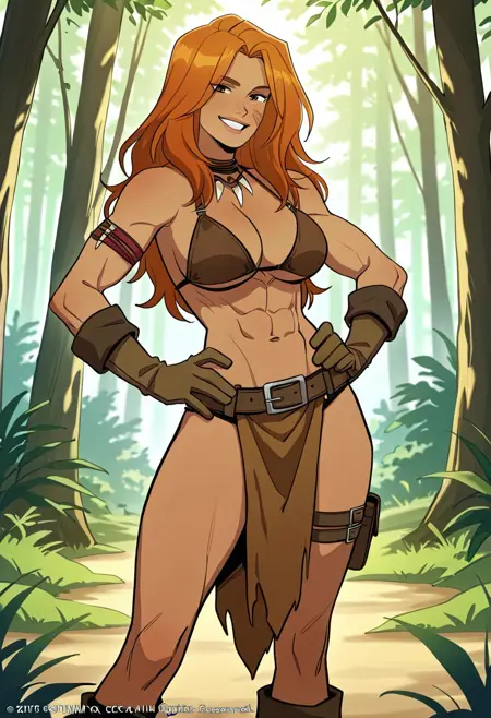orange_hair, facial_scars, cheek_scars, muscular female, teeth necklace, wavy hair, big breast, wide hips,
