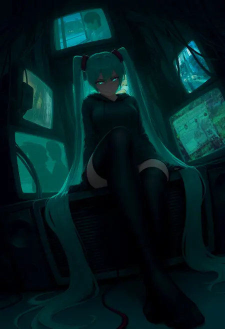 original prompt - mashkaes, 1girl, solo, long hair, twintails, very long hair, aqua hair, aqua eyes, hair tubes