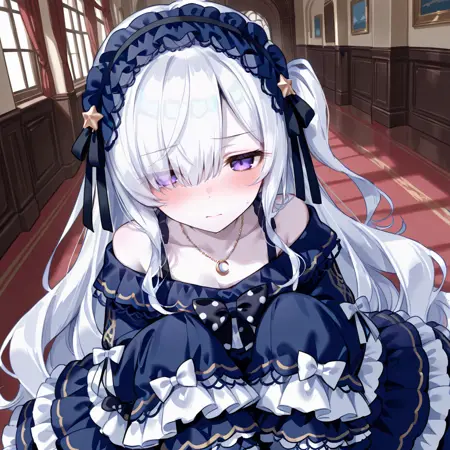 <lora:xmaa1024:1>,dress,hairband,purple eyes,white hair,bow,frills,sleeves past wrists,sleeves past fingers,hair over one eye,very long hair,off shoulder,necklace,blush,blue dress,frilled dress,jewelry,lolita fashion,