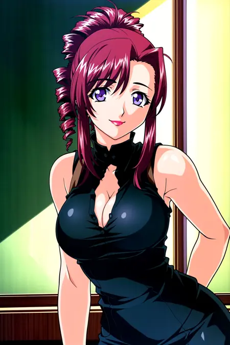 Mizuho Kazami, teacher, chalkboard, shirt, purple eyes, sleeveless, smile, lipstick, head rest, red hair, drill hair, sleeveless shirt, makeup, sidelocks, bare shoulders, bangs, long hair, ponytail, mature female