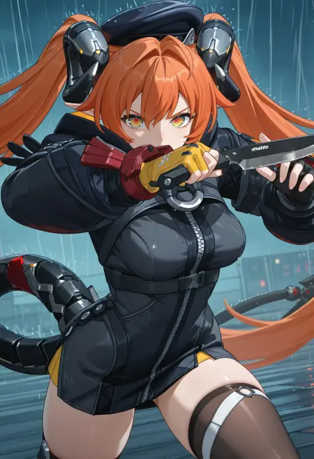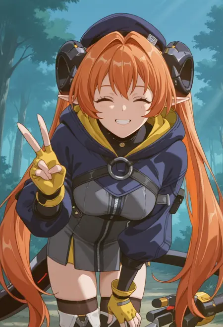0rph3u5, multicolored eyes, (green eyes:0.6), orange eyes, yellow eyes, orange hair, very long hair, hair intakes, twintails, curled horns, beret, turtleneck dress, hood, short dress, thighhighs, fingerless gloves, single yellow glove, medium breasts, mechanical tail