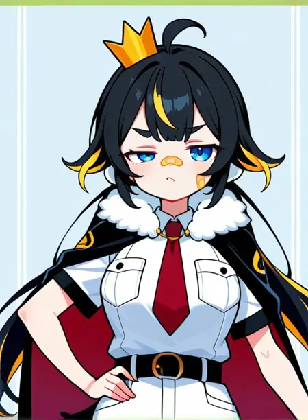 TokoVT, 1girl, black hair, blue eyes, bandaid on nose, twintails, low twintails, , ahoge, crown,bandaid on cheek, blonde hair, penguin tail, virtual youtuber,