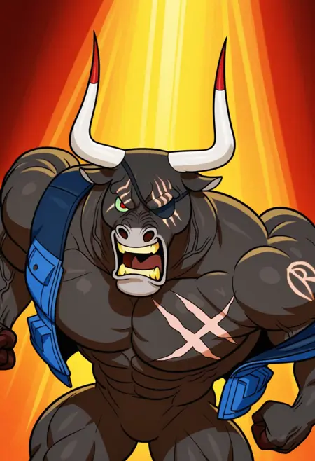 强化提示: "牛尾、黄色巩膜、红眼、遮眼、眼罩、疤痕、胸部疤痕"