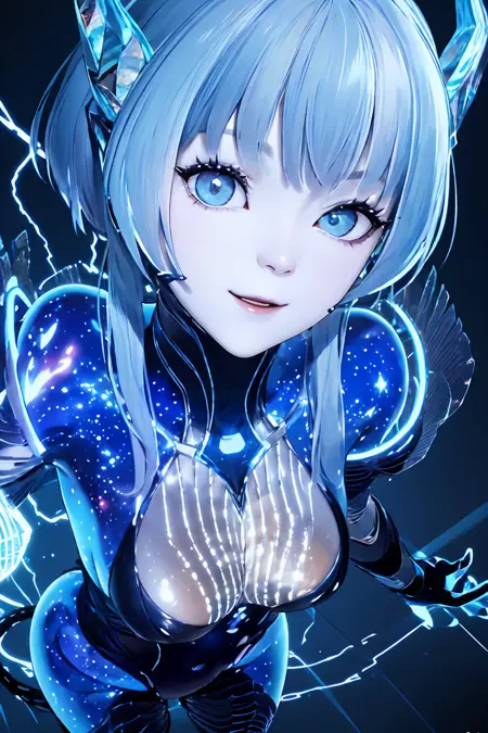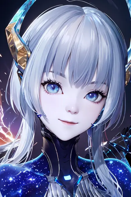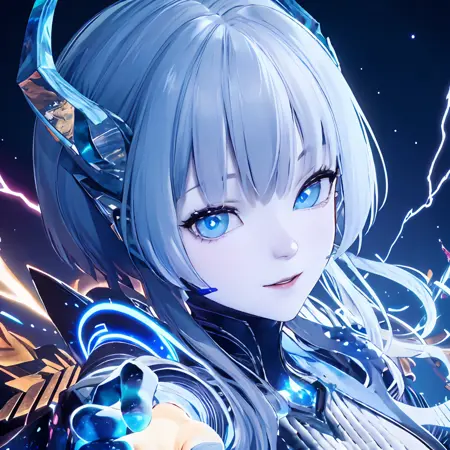 lbc_巴巴塔,1girl,Devil's Horns,wings,looking at viewer,bangs,blurry background,blue eyes,long hair,glowing,upper body,depth of field,solo,glowing eyes,lora:lbc\_babata:0.6,......