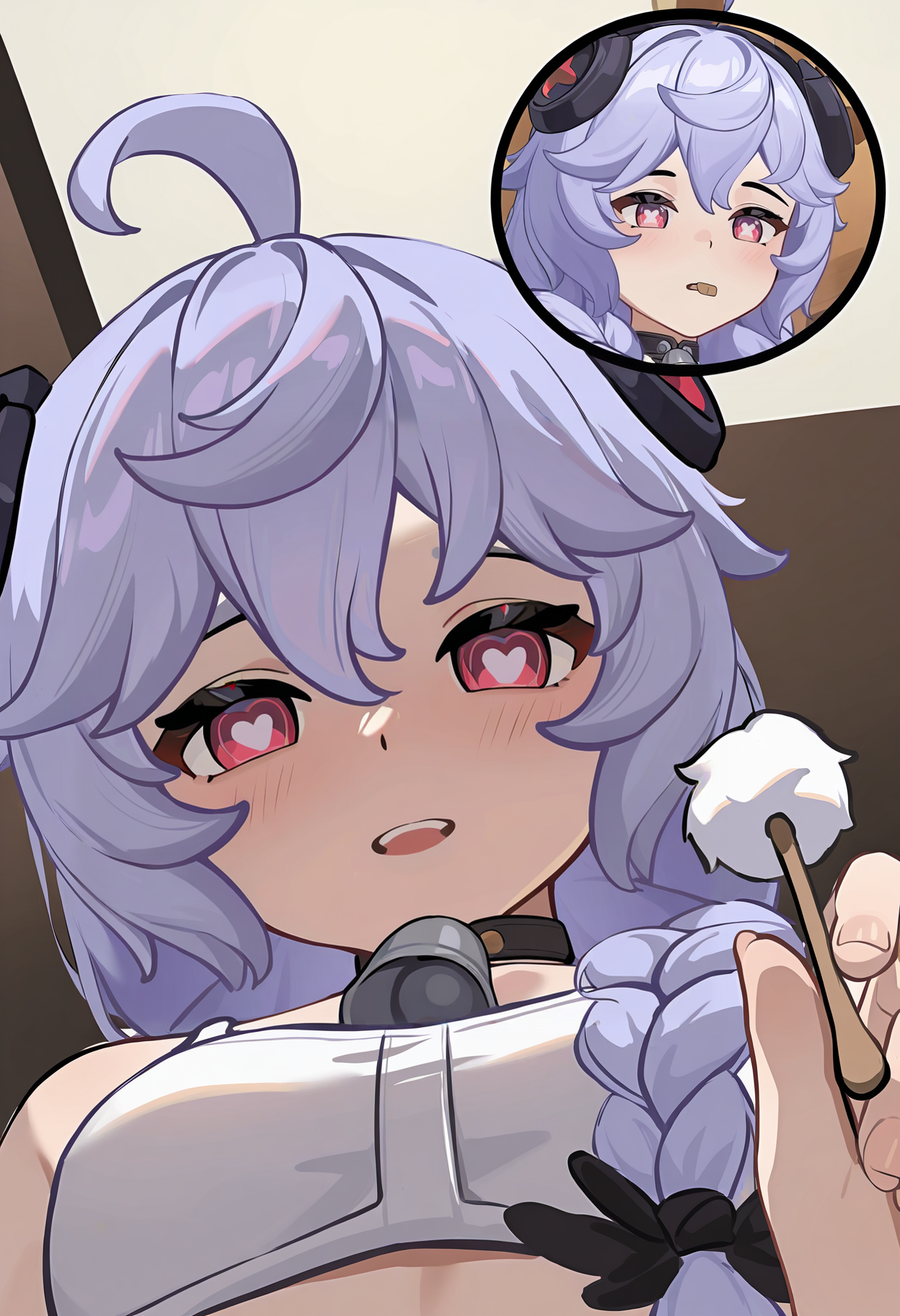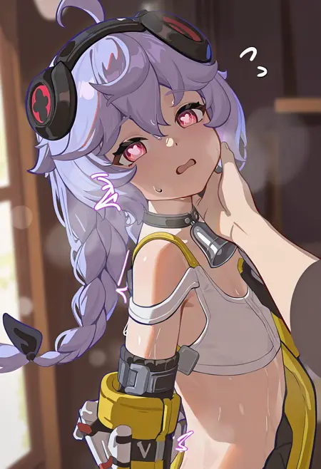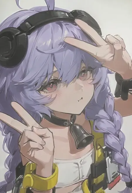 Trigger Word: meikanika,1girl,long hair,braid,ahoge,purple hair,twin braids,hair between eyes,neck bell,red eyes,bell,braid,pink eyes,detached sleeves,bra,white bra,thigh strap,