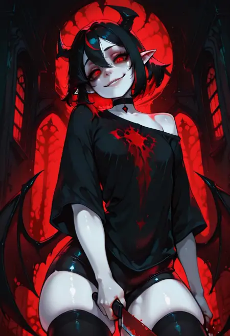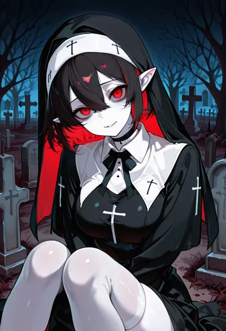 | トレーニングワード | Ryre, red eyes, short hair, hair between eyes, two-tone hair, black hair, red hair, pointy ears, white skin, black choker, cute fang,コピーしました! corset, bare shoulders, bridal gauntlets, midriff, short shorts, thighhigh boots,コピーしました! nun, nun outfit, nun's habit, black dress, white thighhighs,コピーしました! Petite, small breasts, skinny, wide hips,コピーしました! |